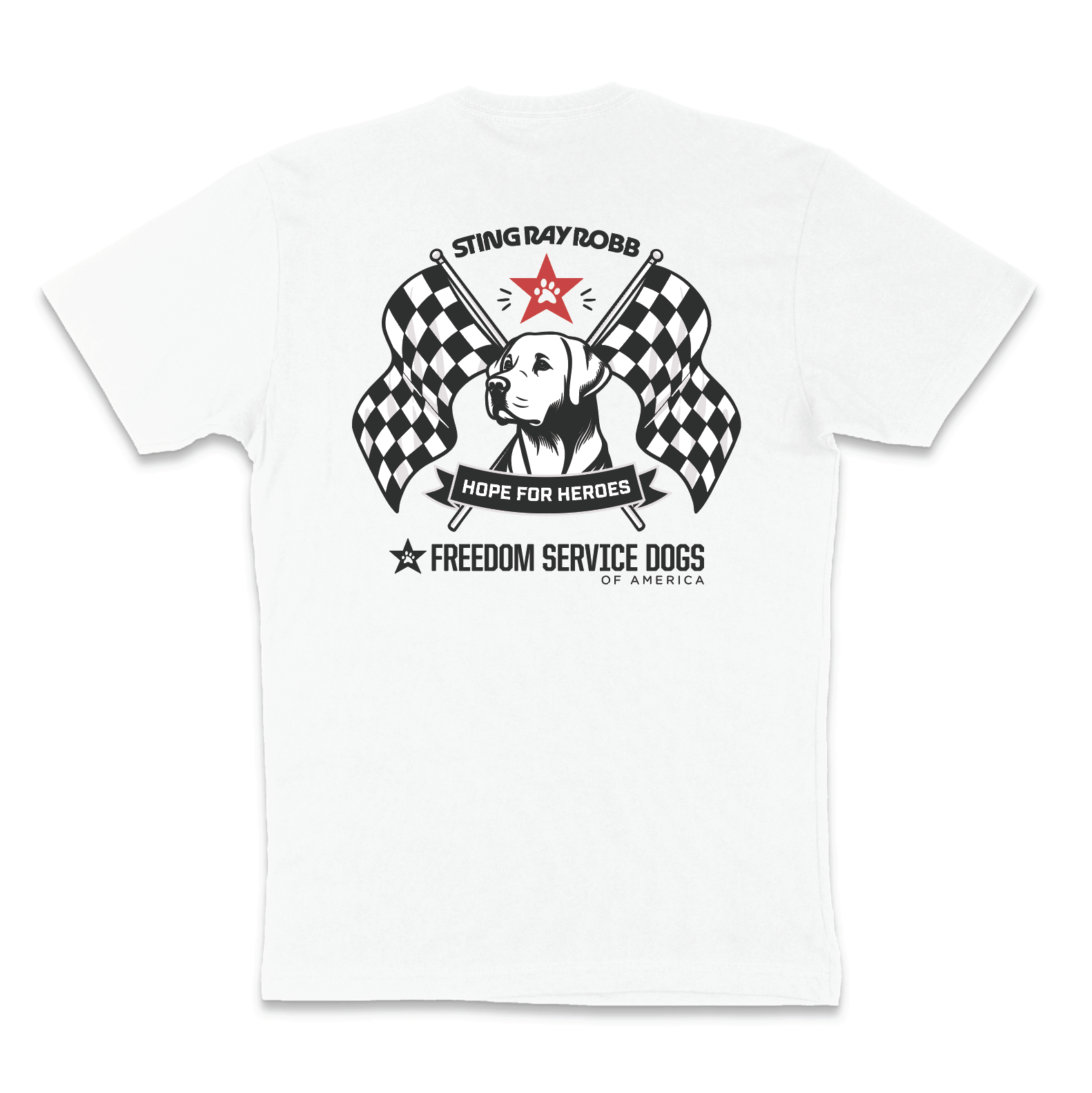 Worn with purpose. The Hope for Heroes Tee features Sting Ray Robb’s name boldly across the front, symbolizing strength, speed, and service. On the back, a custom design honors our 2025 partner — Freedom Service Dogs — and the lives they transform. A portion of proceeds from every shirt supports their mission, helping train service dogs for veterans, first responders, and others in need. Part of the Hope for Heroes campaign, this tee stands for more than racing — it stands for those who serve.
